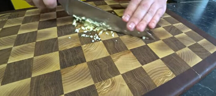 Замороженный продукт правильно разморозить. Чеснок очистить и нарезать зубчики мелкими кубиками.