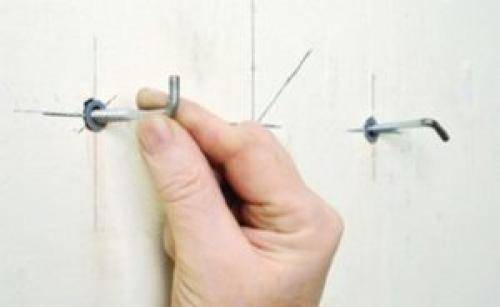 Если работы выполняется на поверхность оформленную гипсокартоном, то использовать нужно специальные дюбеля-бабочки. Они имеют продольные рёбра, которые не дают дюбелю проворачиваться, а стопорный болтик удерживает и не даёт креплению провалиться в стену.