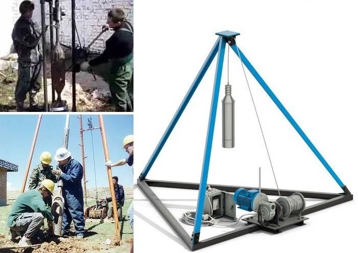 Используется оборудование под названием тренога. Сооружение высотой в два метра, которое конструируется прямо на самом месте установки. Сверху треноги прикрепляется блок. Через блок кидается трос, в конце устанавливается желонка. Суть приспособления заключается в его опускании и поднимании наверх, используя трос. Желонку очищают от мусора через дырочку, находящуюся на расстояние 50 сантиметров от рамки снизу.