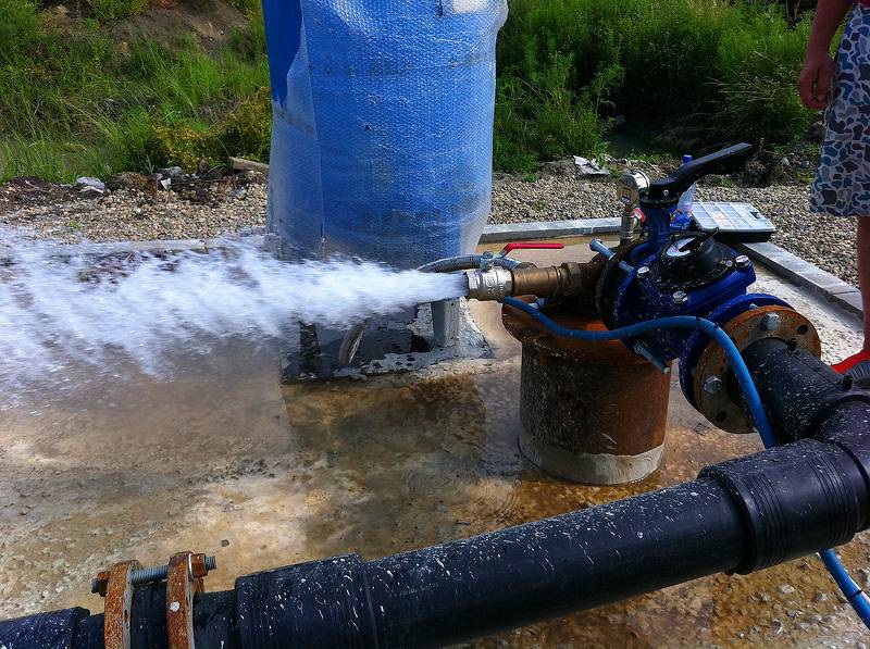 Когда начнет виднеться песок голубовато-сероватого оттенка, можете считать, что работа практически завершена – водоносный слой уже очень близко. Когда появится вода, бур можно убрать, т.к. размытая земля на лопастях держаться не будет. На этом этапе вы вставляете обсадную трубу и можете использовать такой импровизированный источник для полива своих насаждений. Воду из скважины можно поднимать при помощи электрического насоса или обычной ручной колонки. Выбирайте на свое усмотрение и по доступному бюджету.