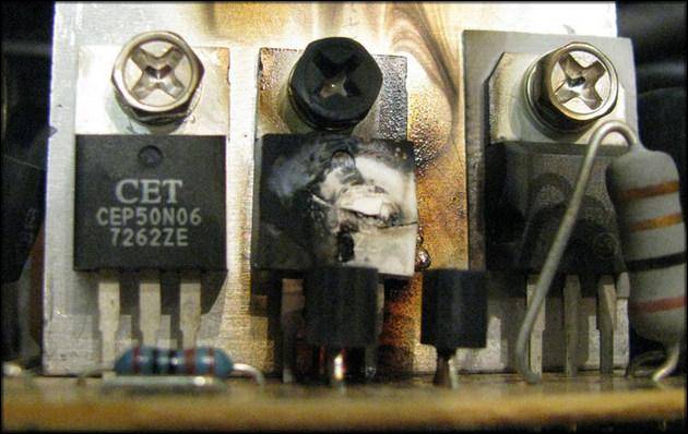 - Перегрев. Многие элементы уже имеют радиаторы, к которым они прикручены. Плохой контакт с радиатором или перегрев от рядом стоящего неисправного трансформатора становится причиной выхода из строя.