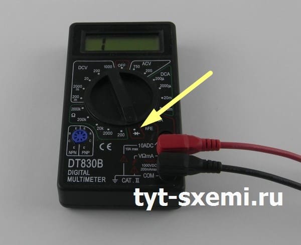 - Для начала подключите щупы таким же образом, как и описанный выше для биполярного устройства. При этом режим мультиметра необходимо привести в положение прозвона, так как измерение показателя сопротивления здесь не будет работать. Это легко сделать, на каждом мультиметре есть специальный тумблер, который позволяет перевести прибор в другой режим.