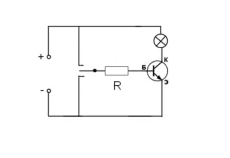 В ней применяется источник постоянного напряжения 10−14 вольт. Нагрузкой цепи служит лампочка. В качестве резистора используется элемент мощностью 0,25 Вт. Его сопротивление рассчитывается по формуле h21*U/I, где: