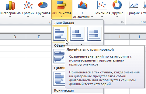 Выделяем весь диапазон ячеек, по которому будем рисовать диаграмму. Нажимаем на раздел меню «Вставка» и там выбираем, какой тип диаграммы нужен. Например, простой линейчатой будет достаточно.