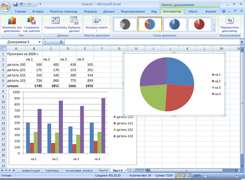 Для построения необходимо выделить таблицу и открыть «Мастер диаграмм», с помощью которого происходит создание и редактирование. В 2007 Офисе этот процесс происходит через выбор типа диаграммы на ленте Пользовательский интерфейс.