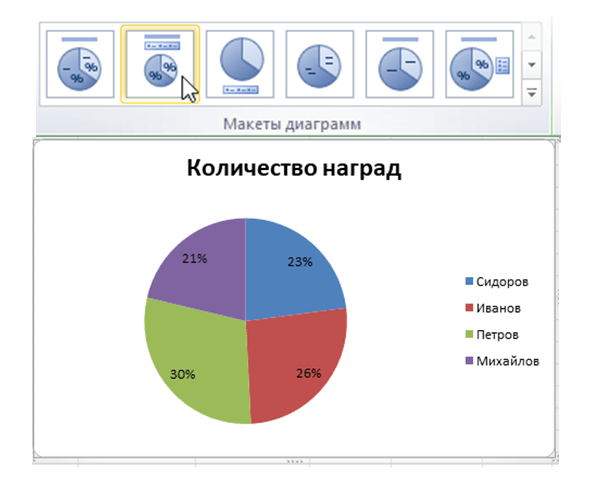 Теперь нам нужно сравнить, какое процентное соотношение по количеству наград в общем занимает каждый спортсмен. Для этого снова выделяем диапазон, выбираем «Вставка» и отмечаем «Круговая диаграмма». Получится простая круговая диаграмма, где цветом показан результат каждого участника. Но мы хотим увидеть процент – для этого можно выбрать нужный макет среди всех круговых диаграмм. Таким образом мы получим процентное соотношение по всем спортсменам.