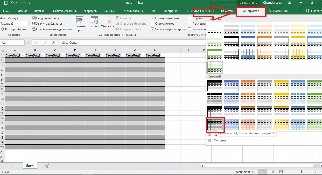 - Форматирование. Функция доступна на вкладке «Конструктор». Предварительно настроенные стили находятся в разделе «Стили таблиц». При желании вы можете сделать собственное форматирование: изменить цвет, отображение кнопки фильтров, строк заголовков и итогов.