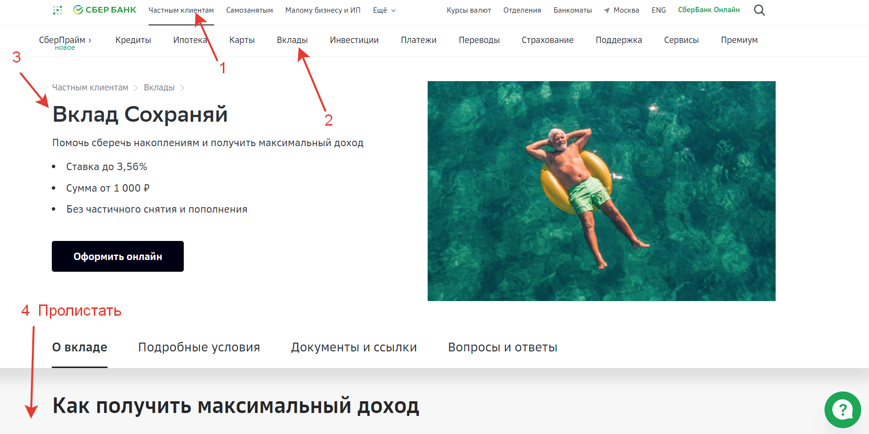 В открывшемся окне будет вся информация по вкладу. Ваша задача – немного пролистать страницу и найти калькулятор. В калькуляторе можно выбрать/указать: