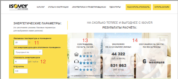 Большое значение имеют и расходы на отопление: чем эффективнее теплоизоляция, тем меньше денег будет уходить на топливо для обогрева. Указав его стоимость (12), вы увидите в правой части окна калькулятора справочные данные об экономии тепла и о сокращении теплопотерь в процентах к неутеплённому дому (13), а также планируемое сокращение расходов на отопление в рублях и срок окупаемости утеплителя (14).