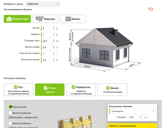 Проделаем это для стен каркасного дома с внутренней обшивкой гипсокартоном толщиной 12,5 мм в районе подмосковного Подольска. Параметры дома — на рисунке ниже (10). Калькулятор автоматически предлагает оптимальное решение по теплоизоляции под каждый утепляемый конструктив. Мы рассмотрим два варианта: утеплитель для всего дома ИЗОВЕР Профи (λ = 0,037) и базальтовую вату ИЗОВЕР Мастер Тёплых Стен (λ = 0,035).
