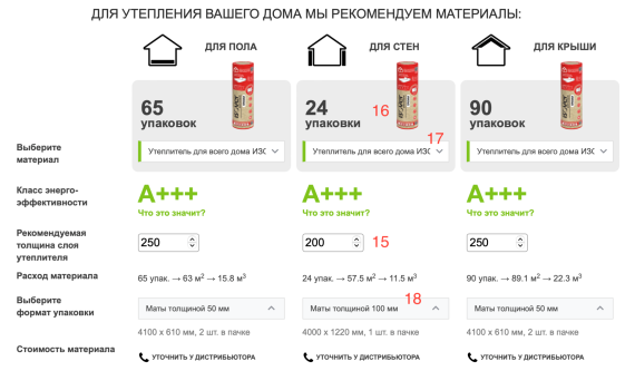 Нижняя часть окна — это собственно расчёт оптимальной толщины слоя выбранного утеплителя (15) и его расход в упаковках (16) для последующего заказа. Если вы хотите изменить выбор, то это можно сделать прямо здесь (17), к началу вычислений возвращаться не обязательно. Причём система позволяет выбирать как продукт, так и его расфасовку (18).