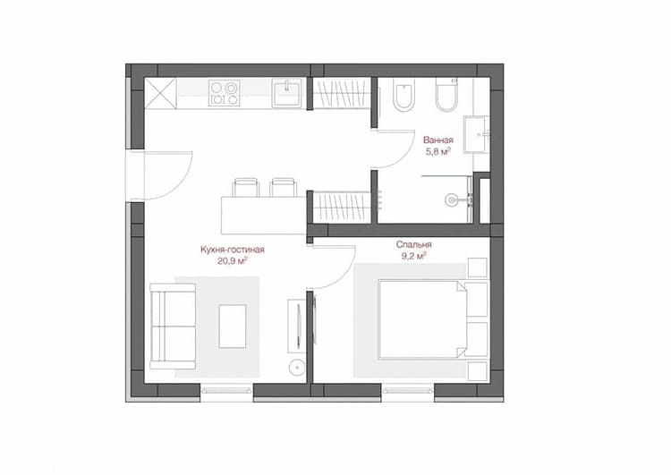Квартиры с квадратной конфигурацией, как правило, небольших размеров со средней площадью порядка 30 м². Однако и такое ограниченное пространство можно обустроить с комфортом, если использовать мебель-трансформер и грамотно сгруппировать предметы обстановки. Рабочая зона устраивается у окна, а если в квартире высокие потолки, то можно применить многоуровневые решения.