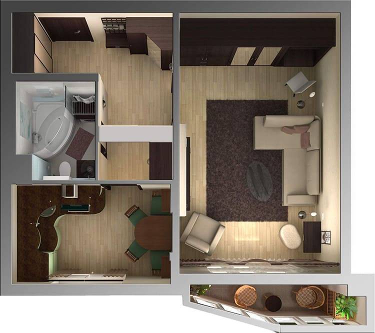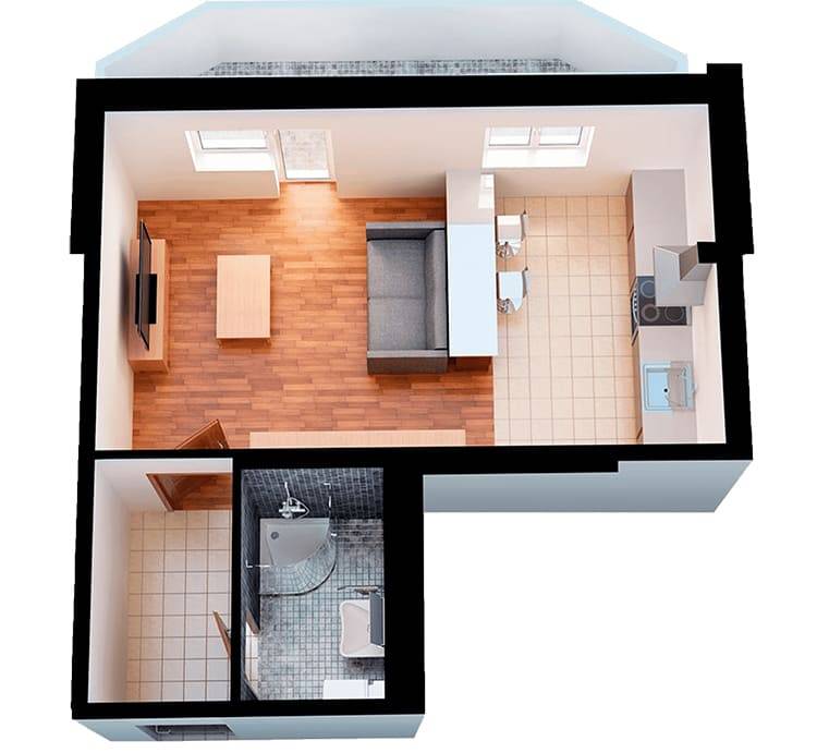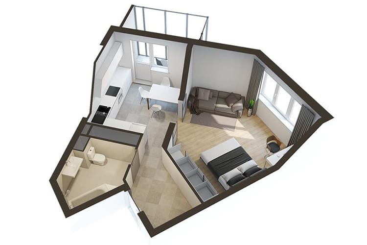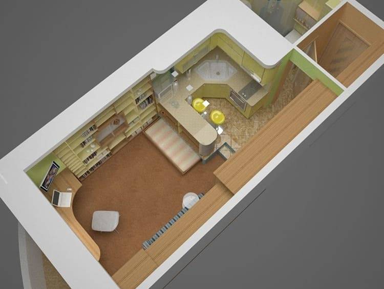 Угловое расположение подразумевает большее количество окон, чем в квартире, расположенной посередине здания. Это бесспорное преимущество может быть удачно использовано при зонировании малогабаритного жилья. Благодаря обилию дневного света, помещение будет казаться визуально просторнее. Пространство у одного из оконных блоков можно отвести под рабочее место. А кухню объединить с гостевой зоной. Спальное место рекомендуется максимально изолировать от остального пространства. Если в квартире есть балкон или лоджия, то спальню можно обустроить там, предварительно проведя работы по остеклению и утеплению.