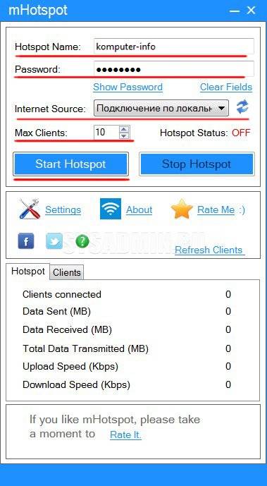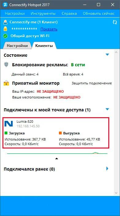 Сохранить изменения кнопкой Start Clients. Статус Hotspot: ON свидетельствует о том, что программа активна. В нижней части окна приложения доступна статистика. Здесь есть информация о количестве пользователей в данный момент и о потребленном ими трафике.