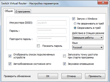 Все настройки интуитивно понятны, программа полностью переведена на русский язык. Также вводим имя сети и пароль, нажимаем «Применить», и можно пользоваться. Дополнительно можно настроить режим работы в спящем режиме, запуск при старте Windows и отображение списка устройств, подключенных к сети.