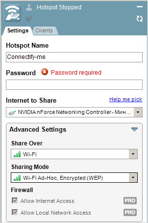 Приложение Connectify отличается от предыдущих множеством настроек. Чтобы оно заработало, нужно отрегулировать его параметры следующим образом: