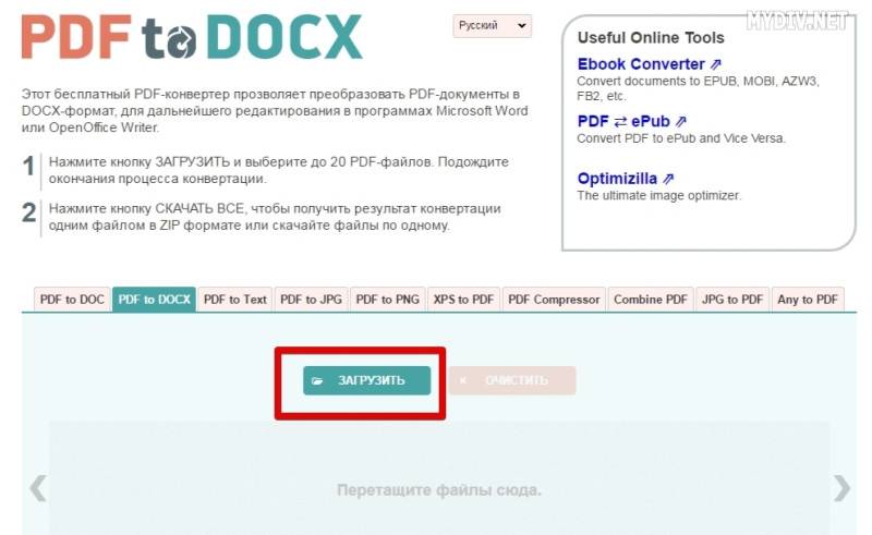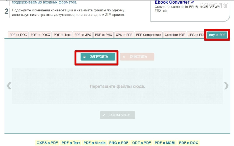 Возвращаемся на страницу конвертера pdf2docx, выбираем опцию Any to PDF и загружаем наш отредактированный текстовый файл (кнопка Загрузить):