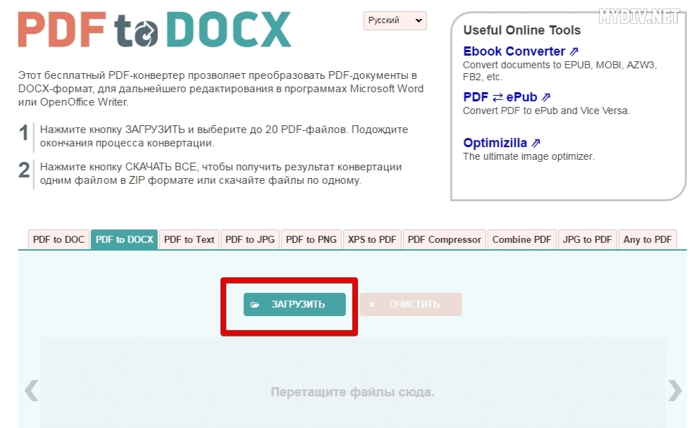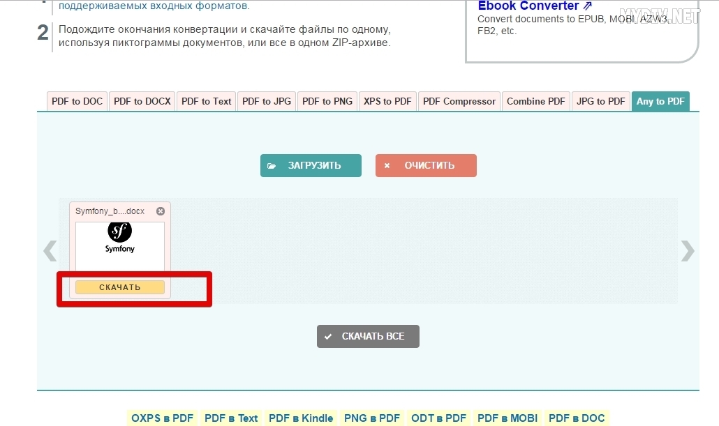 Возвращаемся на страницу конвертера pdf2docx, выбираем опцию Any to PDF и загружаем наш отредактированный текстовый файл (кнопка Загрузить):