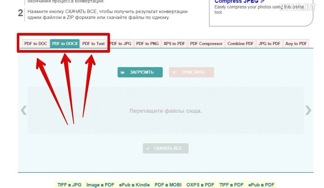 Переходим на страницу сервиса pdf2docx и выбираем формат текстового документа. Это может быть PDF to DOC, PDF to DOCX или PDF to Text: