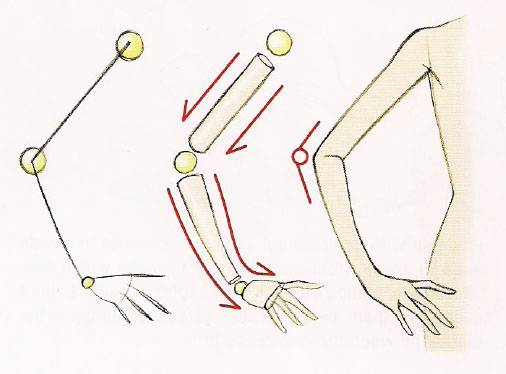 Начало руки исходит из плеча, локоть располагается на линии талии, запястье — на линии середины таза, а кончики пальцев — примерно на середине между коленом и бедром. Верхняя часть руки почти вся прямая как труба, кроме дельтовидной мышцы плеча. Контуры нижней части руки расширяются небольшим изгибом, и сужаются к кисти, принимая форму буквы «S», двигаясь к большому пальцу.