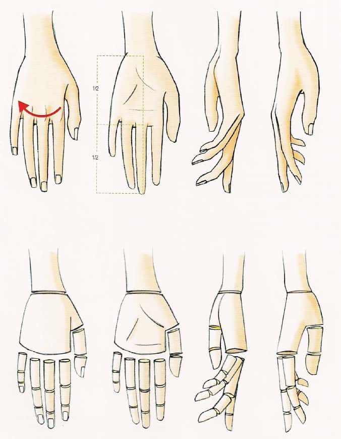 Длина кисти равна ¾ головы, а ладонь такая же длинная, как средний палец. Наблюдая за основанием и кончиками пальцев, вы заметите, что они расположены веером. Рисуйте пальцы согнутыми, чтобы разделять их один от другого.
