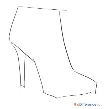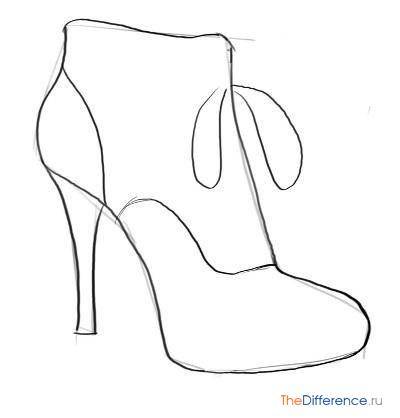 Если вы хотите нарисовать туфли-лодочки, впереди обозначьте носок, он может быть как круглым, так и заостренным. А сбоку проведите линии: одну, та, что ближе, рисуем ниже, а ту, что дальше выше.