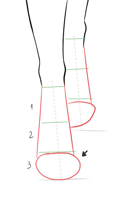 Теперь дайте объём. Как видите, это сплющенная изогнутая пирамида с вершиной, смещённой к пятке: круг – это участок, где нога соединяется с ногой и образует лодыжку. Пунктирные линии обозначают объём. Для обрисовки требуется только чёрный контур.