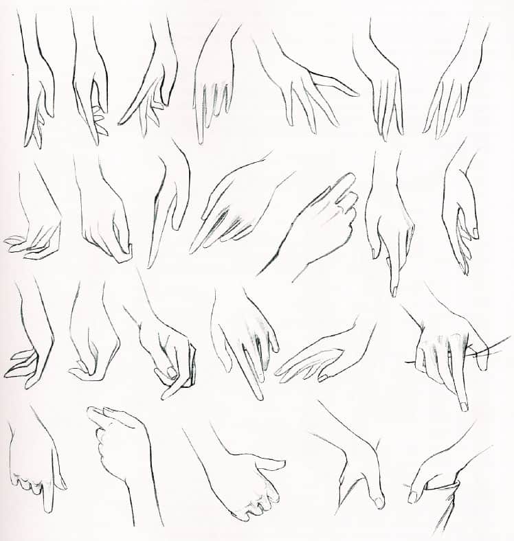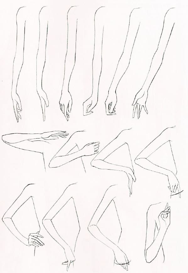 Представьте, что рука и кисть всегда вместе. Попрактикуйте рисование различных положений руки, начиная от плеча и заканчивая кончиками пальцев.