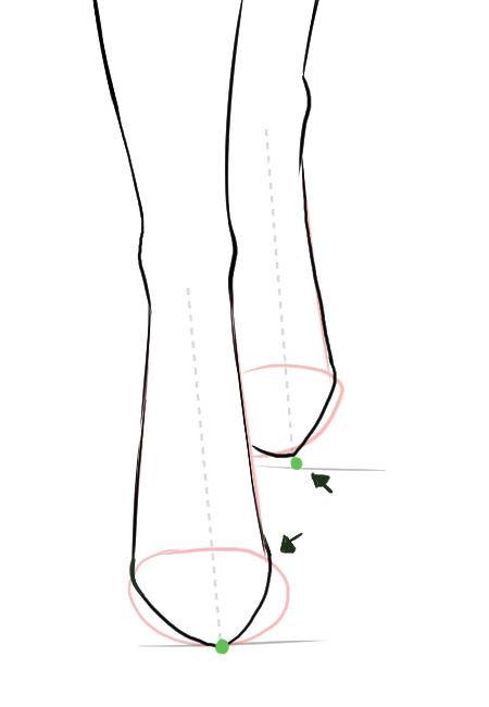 - На виде спереди внутренняя сторона ноги вертикальна, а внешняя сторона отклоняется.