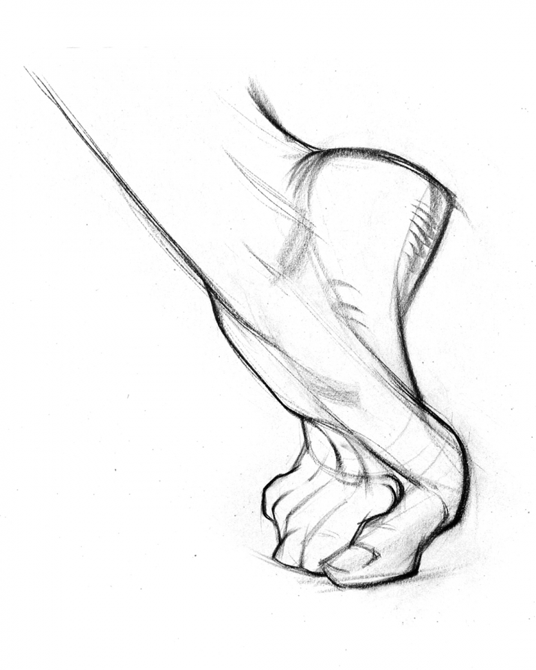 Наконец, добавьте пальцы. Вы можете рисовать их по отдельности, независимо от основной формы, которая, как уже говорилось, почти не гнётся. Если надо, нарисуйте направляющую линию, чтобы определить общую форму пальцев (см. линии ниже), прежде чем рисовать их по отдельности. Они прижаты друг к другу, поэтому почти со всех углов перекрываются