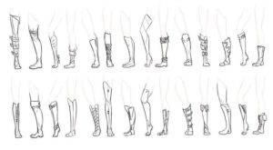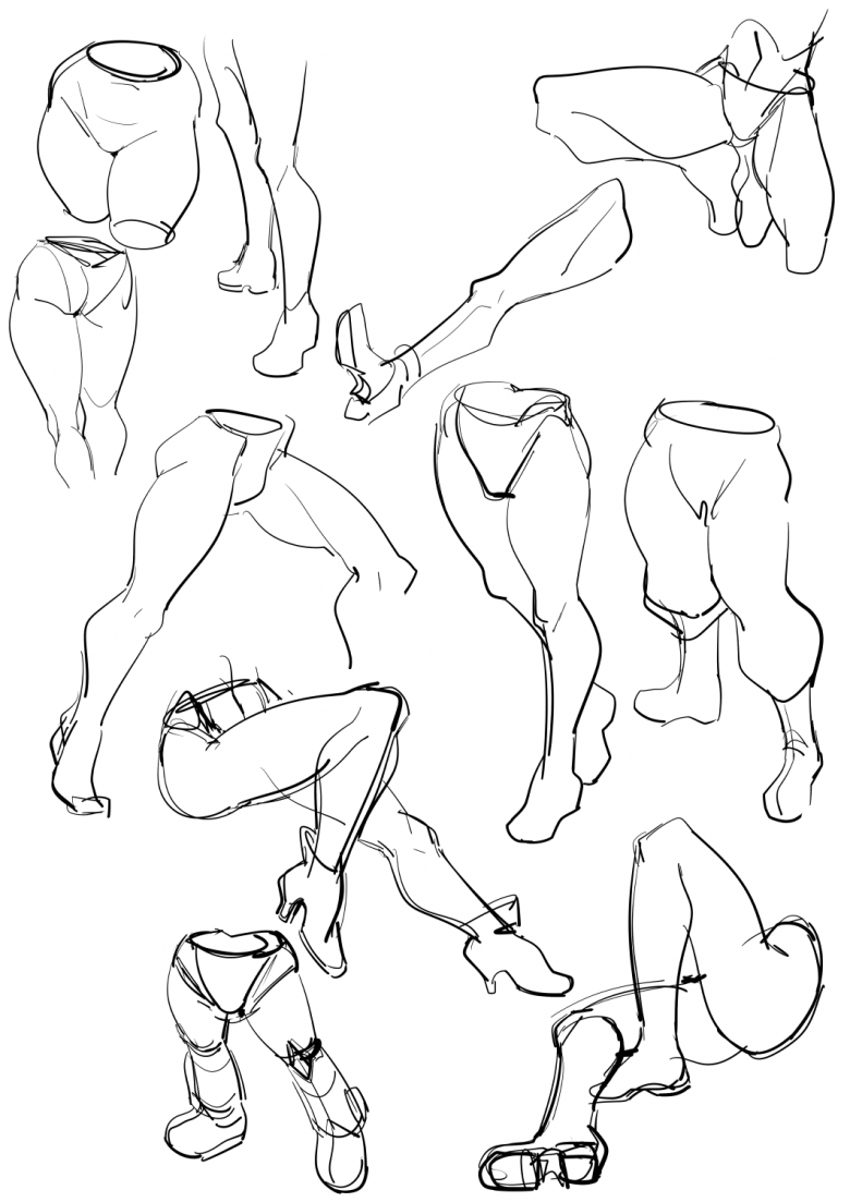 По сравнению с руками, ноги, занимающие почти половину человеческого роста и поддерживающие всё тело, состоят из динамических элементов. Рисуя ноги, помните об этом, и используйте динамичные линии, это поможет вам ухватить изображение. Хотя они обычно спрятаны под одеждой, вам не следует пренебрегать практикой их рисования, так как есть много одежды, где ноги открыты.