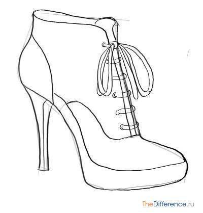 - после приступаем к подошве и каблуку. Высота каблука должна соответствовать высоте подъема. Помните, как нарисовать туфли, это не проблема. Сосредоточьтесь на конечном результате.