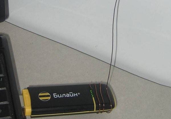 Это самый простой и примитивный вариант усиления сигнала своими руками. Необходимо взять обыкновенную медную проволоку и одним его концом на 3–4 витка обмотать верхнюю часть 4G-модема. Другой конец поднять кверху. Этот способ ненамного усилит сигнал, но всё же может сделать связь более стабильной.