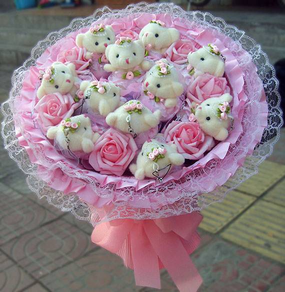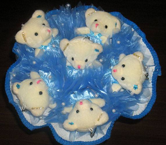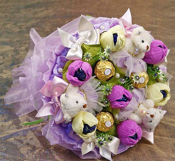 Место склеивания можно обернуть ленточкой и завязать красивый бант. Букеты из игрушек можно дополнить всевозможными бусами, стразами, ленточками, вставить искусственные цветы или конфеты.