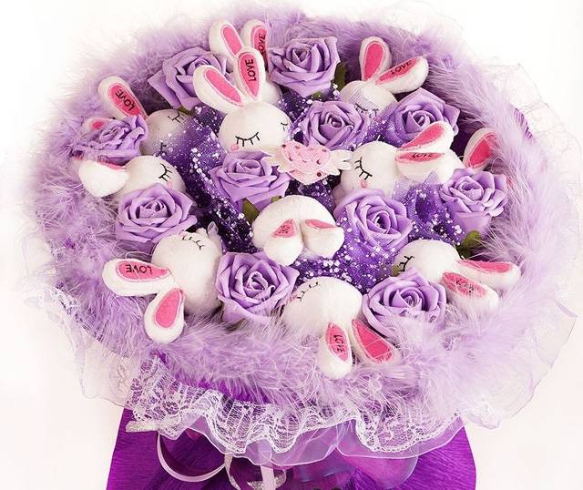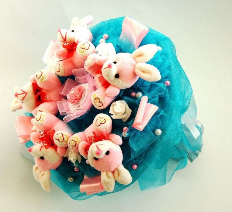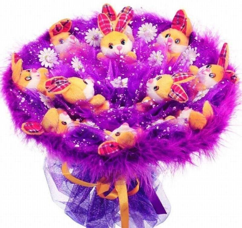 Зайчики выглядят не менее мило, чем медвежата. Поэтому отлично подойдут для букета.