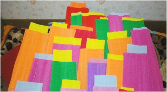- Чтобы дополнительно украсить гофрированную бумагу, необходимо сначала мягко загнуть края более светлого листа примерно на два сантиметра внутрь, а потом легкими движениями пальцев прищипывать края через промежутки 2-4 сантиметра, создавая «волны». Те же действия необходимо проделать с темным оттенком, создавая пышную нижнюю «юбку».