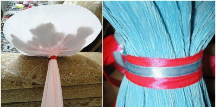 - После создания основы букета, следует приступить к основному декору. Отрежьте нужное количество (60-80 сантиметров) гофрированной бумаги двух цветов. Сложите вместе края листов по отдельности, скрепите при помощи степлера. Когда оба куска гофры будут скреплены, одну сложите в другую, чтобы внешний рулон находился на уровне 7-10 сантиметров над внутренним.