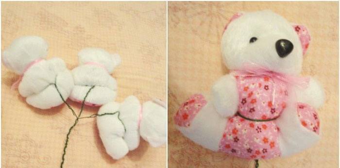 - Сперва скрепите из проволоки специальную палочку и разделите ее конец на несколько частей. Игрушки должны плотно сидеть на проволоке и не болтаться. Для этого обмотайте мишек проволокой в области живота.