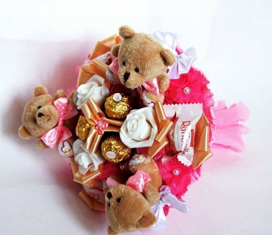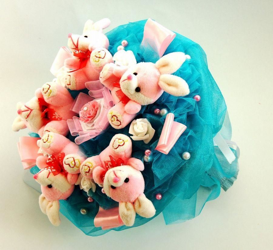 Место склеивания можно обернуть ленточкой и завязать красивый бант. Букеты из игрушек можно дополнить всевозможными бусами, стразами, ленточками, вставить искусственные цветы или конфеты.