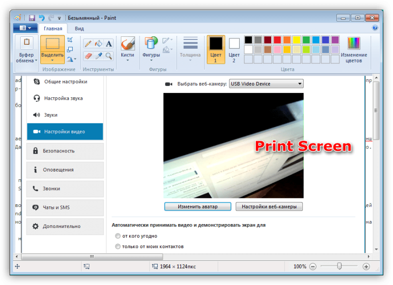 Перейдя в настройки видео, мы ничего не делаем, кроме нажатия кнопки Print Screen. После этого, если к ней не привязана программа по созданию скриншотов, результат можно открыть в любом редакторе изображений, том же Paint. Дальше все просто – обрезаем лишнее, если требуется, что-то добавляем, убираем, после чего сохраняем готовое фото.