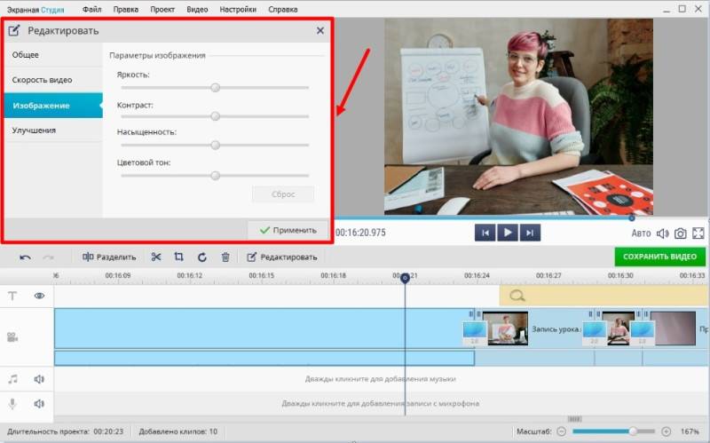 В студии редактирования, которая открывается после записи, попробуйте функцию автоматического улучшения видео. В ее основе лежат алгоритмы искусственного интеллекта, которые помогают скрыть недостатки освещения. Это особенно актуально, если нет возможности задействовать профессиональное освещение для съемки блога.