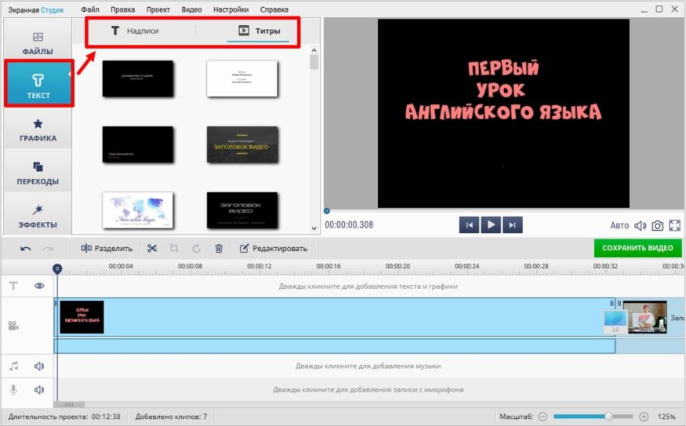 Перетащите плавные переходы, чтобы смягчить переключение с одного кадра на другой. Для оформления вступительной заставки откройте вкладку «Текст» → «Титры», выберите подходящий шаблон и поменяйте надпись, стиль ее написания и фон.