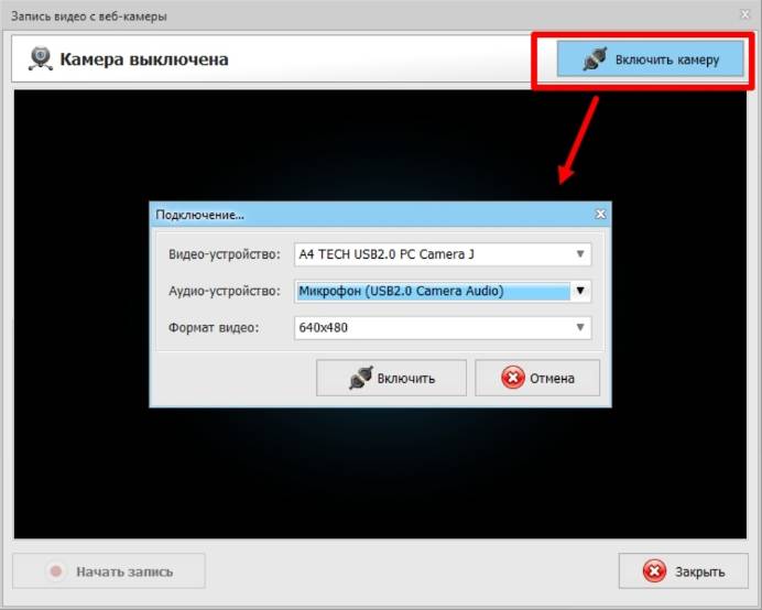 В правом верхнем углу кликните «Включить камеру», после чего настройте подключение: выберите аудио- и видеоустройство, выставьте разрешение.