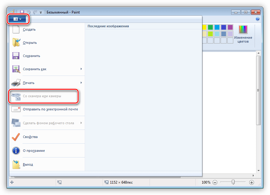 Далее нужно нажать кнопку, указанную на скриншоте, и выбрать пункт «Со сканера или камеры».