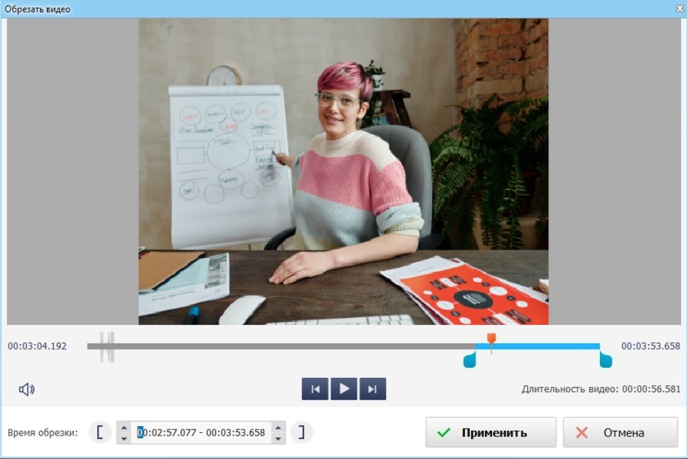 Чтобы удалить ненужные фрагменты, выберите инструмент «Обрезать», кликнув правой кнопкой мыши на видео. Маркерами выделите участок, который хотите оставить.