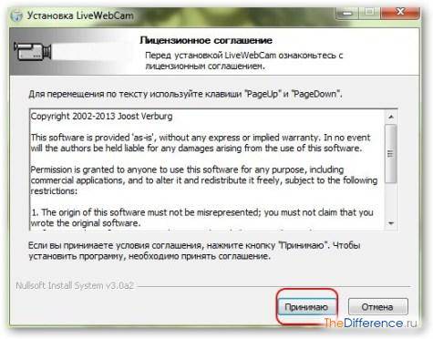Распакуйте архив и запустите инсталлятор программы livewebcam.exe двойным кликом левой кнопкой мыши. На первом этапе установки примите соглашение кликом по кнопке «Принять».