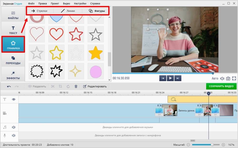 Если важно акцентировать внимание на некоторых областях экрана, используйте графические элементы: стрелки, овалы, линии и другие фигуры. Щелкните на понравившийся элемент и расположите его на экране, отредактируйте размер и прозрачность, добавьте анимацию или тень
