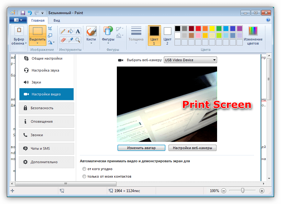 Перейдя в настройки видео, мы ничего не делаем, кроме нажатия кнопки Print Screen. После этого, если к ней не привязана программа по созданию скриншотов, результат можно открыть в любом редакторе изображений, том же Paint. Дальше все просто – обрезаем лишнее, если требуется, что-то добавляем, убираем, после чего сохраняем готовое фото.