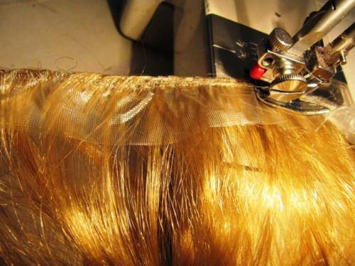 Таким же образом поэтапно следует приплести к нити все имеющиеся волосы. А прикрепить к трессу ленту или резинку для волос совершенно несложно. Это обычно делатся вручную очень мелкими стежками.