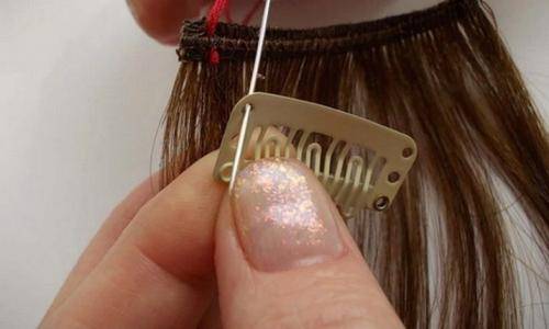 Для фиксации готового изделия на голове к трессам нужно пришить заколки.